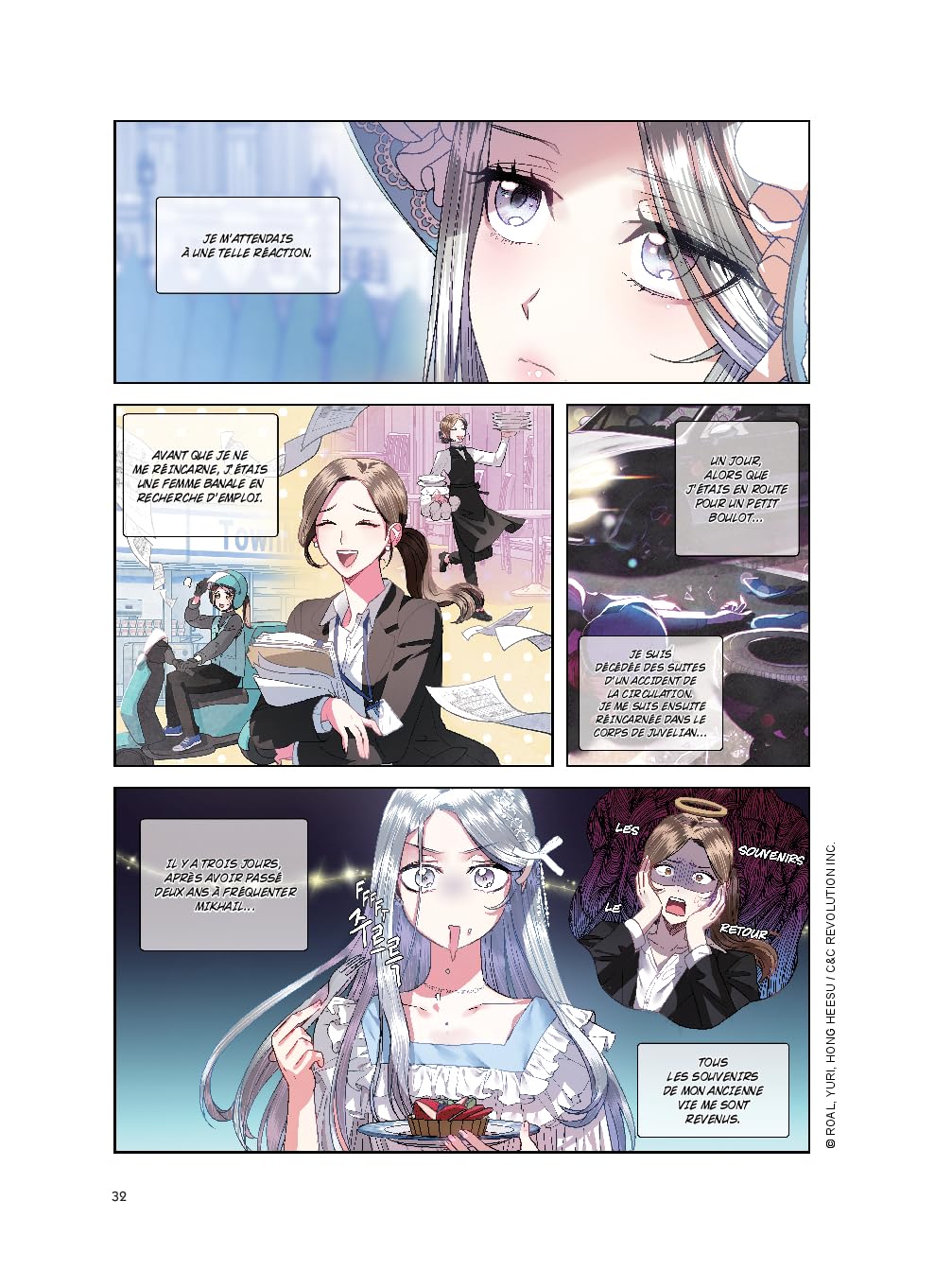 Comme je l'ai souvent vu dans les titres de ce genre, le début du récit est rentre dedans et un peu « violent », puisque c'est le moment où on débarque sans vraiment de contexte, on peut être un peu perdu, et c'est aussi dès le début que le personnage central du récit meurt et que notre héroïne (qui meurt aussi dans sa vraie vie) prend sa place. Ici, cette dernière est projetée dans un livre qu'elle a lu et elle va devoir (comme souvent), éviter de mourir dans sa nouvelle vie.